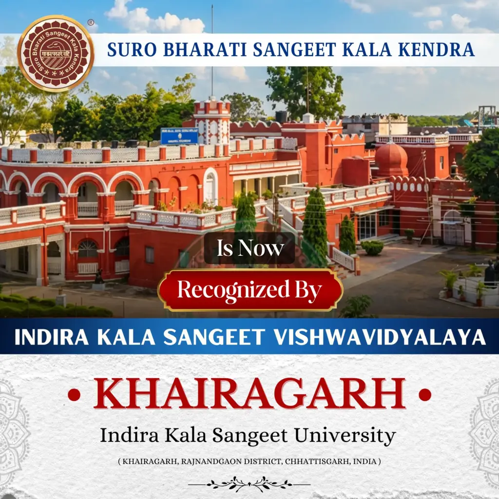 Suro Bharati Sangeet Kala Kendra is now recognized by Indira Kala Sangeet Vishwavidyalaya, Khairagarh (Chhattisgarh).This recognition affirms the credibility of our examination system, the authenticity of our certification process, and the integrity with which we evaluate students’ cultural knowledge and skills.